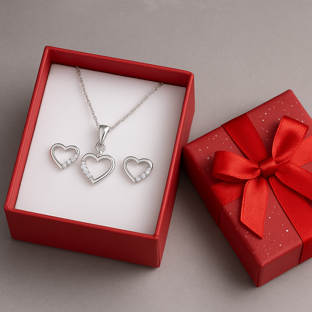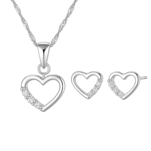 W skład zestawu wchodzą delikatne kolczyki–sztyfty oraz dopasowany naszyjnik z serduszkiem ozdobionym błyszczącymi cyrkoniami.