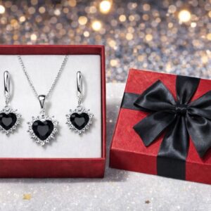 Odkryj wyjątkowy zestaw biżuterii, który zachwyca subtelnym blaskiem i ponadczasową elegancją. Komplet składa się z naszyjnika oraz kolczyków wykonanych z wysokiej jakości srebra próby 925, ozdobionych przepięknym sercem w odcieniu głębokiej czerni oraz błyszczącymi cyrkoniami klasy AAA.