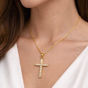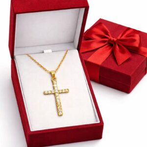 Elegancki, subtelny i wyjątkowo efektowny naszyjnik z krzyżykiem, który pięknie podkreśla dekolt i dodaje stylizacji klasy. Krzyżyk został ozdobiony błyszczącymi cyrkoniami, które cudownie mienią się w świetle – wygląda jak luksusowa biżuteria premium.