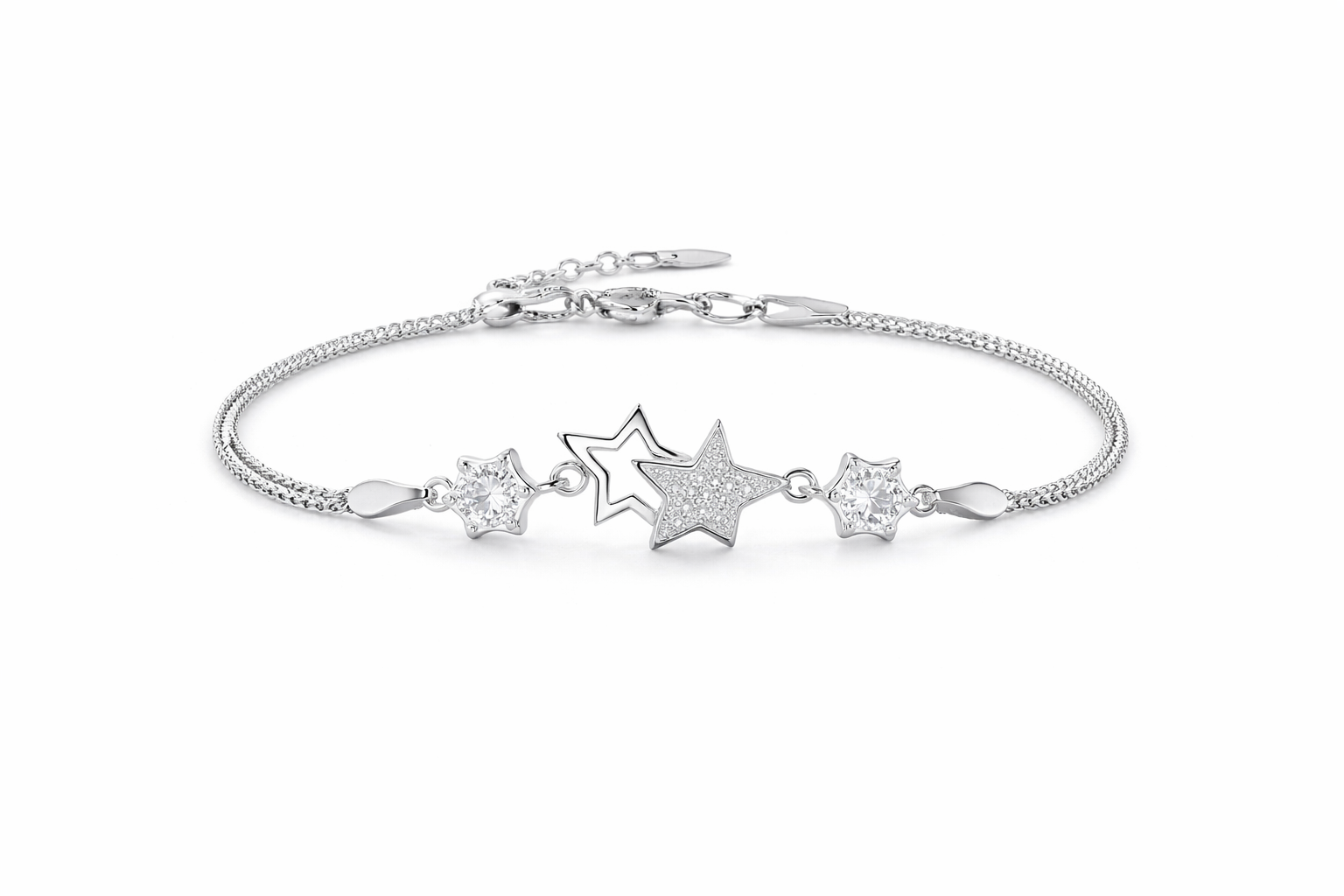 bransoletka srebro 925 gwiazdki, bransoletka damska srebrna, bransoletka z cyrkoniami srebro, bransoletka podwójny łańcuszek srebro, delikatna bransoletka damska, biżuteria srebrna elegancka, bransoletka na prezent dla niej