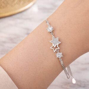 Subtelna i elegancka bransoletka wykonana ze srebra próby 925 to idealna propozycja dla kobiet, które kochają lekkość i ponadczasowy styl. Motyw gwiazdek w połączeniu z delikatnym połyskiem cyrkonii tworzy wyjątkową biżuterię, która pięknie podkreśla nadgarstek ✨